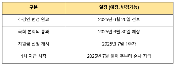정부는 2025년 6월 말까지 2차 추경안 편성 및 국회 통과를 목표로 하고 있습니다. 이에 따라 민생회복지원금 25만원 지급은 7월 초부터 본격 시행될 가능성이 매우 큽니다.