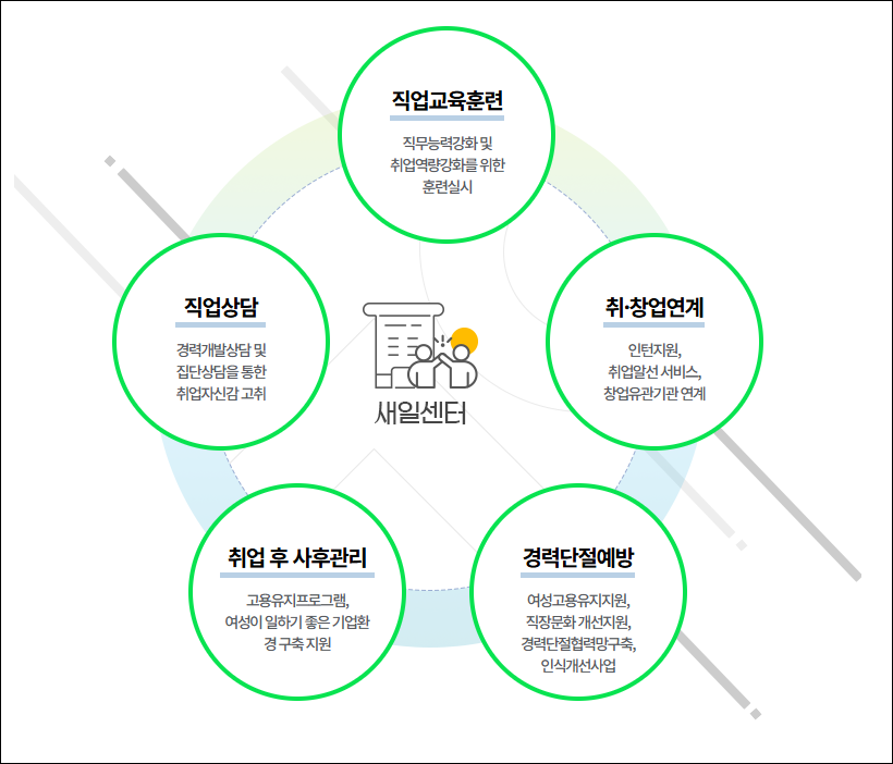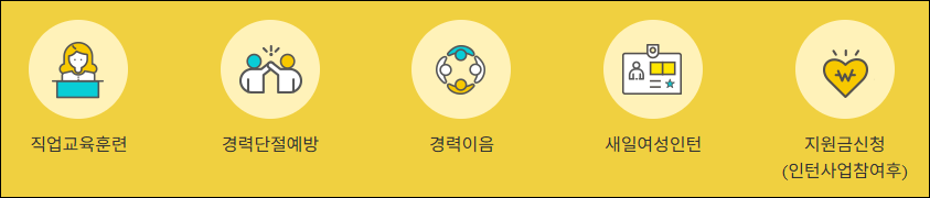 육아/가사 등으로 경력이 단절된 여성등을 대상으로 직업상담, 구인/구직 관리, 직업교육, 인턴십, 취창업지원, 취업 후 사후관리, 경력단절예방 등을 종합적으로 지원