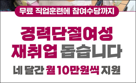 여성새로일하기센터 사이트에서 지원받을 수 있는 여러 내용들을 검토해보시고, 고민보다는 재취업의 기회를 위해 가벼운 마음으로 신청해보시기 바랍니다.