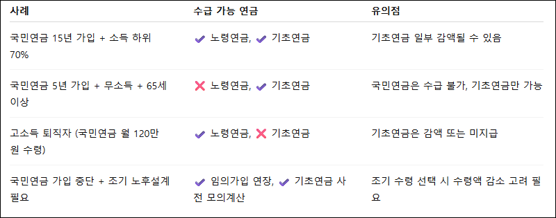 65세 이후: 수급 조건이 충족된다면, 국민연금(노령연금) + 기초연금 중복 수령이 가능합니다.
